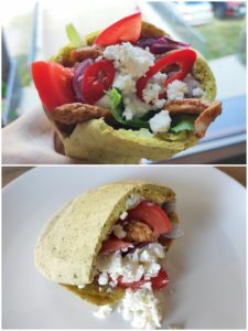 Chlebek pita podgrzewamy na patelni lub w piekarniku. Rozcinamy na pół. Środek smarujemy sosem tzatziki, napełniamy warzywami i naszym kurczakiem. Na wierzch dodajemy sos oraz posypujemy serem feta.