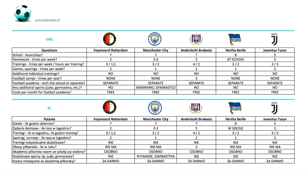 Legia Cup 2017 za nami. Wygrała drużyna Anderlecht Bruksela, a na drugim miejscu uplasowała się drużyna Juventus Turyn, czyli drużyny, które najbardziej nam się podobały Zwyciężyła zatem radość i swoboda gry oraz dojrzałość taktyczna. Co robią młodzi piłkarze czołowych europejskich akademii, że wyglądają lepiej pod względem umiejętności piłkarskich i ogólnego rozwoju fizycznego od polskich młodych piłkarzy, którzy wystąpili w Legia Cup 2017? prostozboiska.pl postanowiło się dowiedzieć ile czasu poświęcają młodzi piłkarze trenujący w pięciu piłkarskich akademiach w Europie na szkolenie piłkarskie. Dotarłam do najlepszego źródła czyli rodziców, którzy odpowiedzieli na moje pytania a ja zestawiłam odpowiedzi w jednej tabeli. Dane dotyczą kategorii U11.
