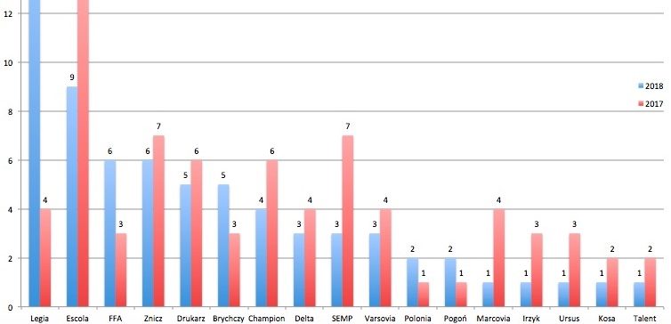 Jak zmieniła się lista w stosunku do ubiegłego roku i czym zmiany są spowodowane? Niewątpliwie nastąpiło wiele przesunięć zawodników między klubami. Można to zaobserwować na podstawie porównania roku 2018 do roku 2017. Przeanalizujcie sami. Czerwony to 2017 rok, niebieski to rok 2018 a cyferki nad kolumnami to liczba powołanych zawodników z poszczególnych klubów.