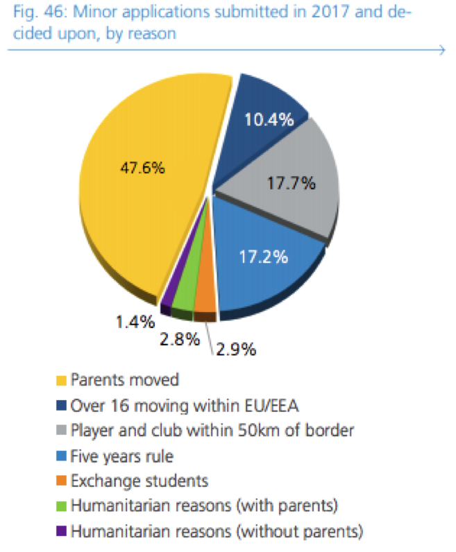 Poniższy diagram ilustruje procentowo kategorie transferów niepełnoletnich piłkarzy w 2017. Prawie 47% stanowiły transfery związane ze zmianą miejsca zamieszkania i przeprowadzką Rodziców.