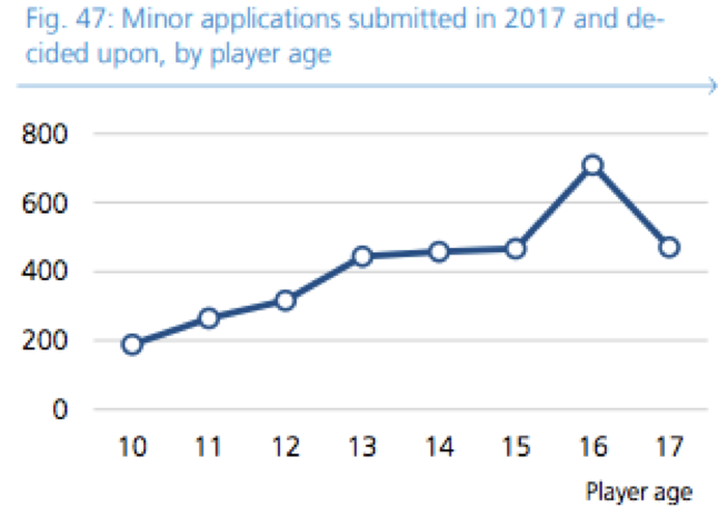 Można zaobserwować znaczący wzrost liczby międzynarodowych transferów zawodników w wieku 16 lat. Co jest tego przyczyną? Otóż od wieku 16 lat można stosować przepisy art. 19 par. 2b (o którym pisałam wyżej) czyli transfer odbywa się na terytorium Unii Europejskiej i zawodnik jest w wieku 16-18 lat. Czyli nie musi znajdować się pod opieką Rodziców. Poza tym w wieku 16 lat zawodnicy często podpisują swoje pierwsze kontrakty.