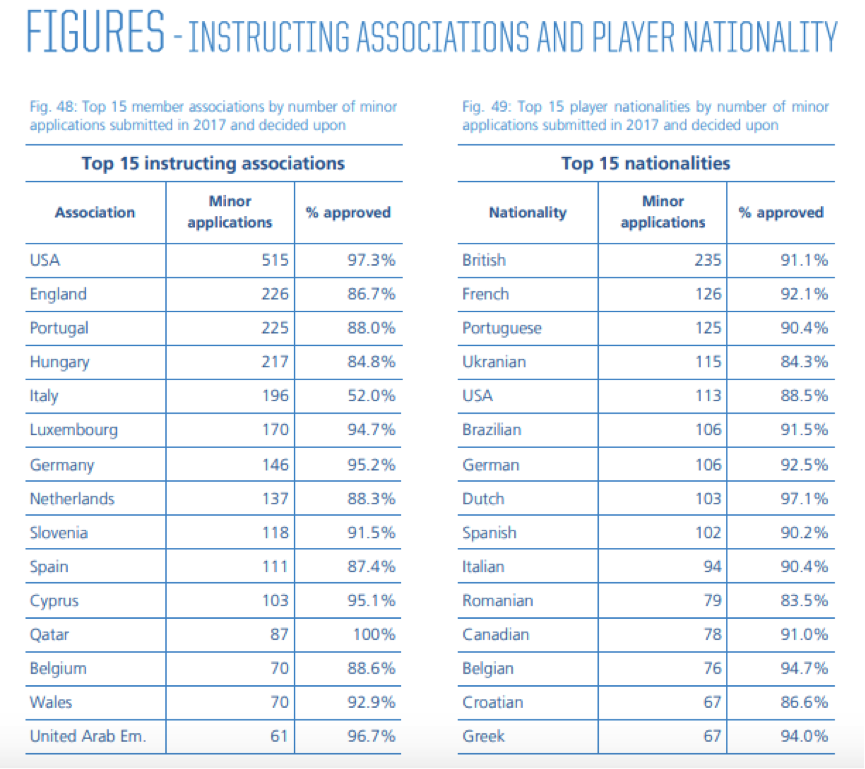 Jeśli interesuje Was jakie federacje zgłaszały najwięcej wniosków transferowych młodocianych piłkarzy oraz jakich narodowości byli młodociani zawodnicy to informacje znajdziecie w poniższych tabelkach. Tabela Fig.48 prezentuje listę federacji, które zgłaszały najwięcej wniosków o transfer młodocianych piłkarzy a tabela Fig.49 prezentuje narodowości najczęściej transferowanych młodocianych piłkarzy: